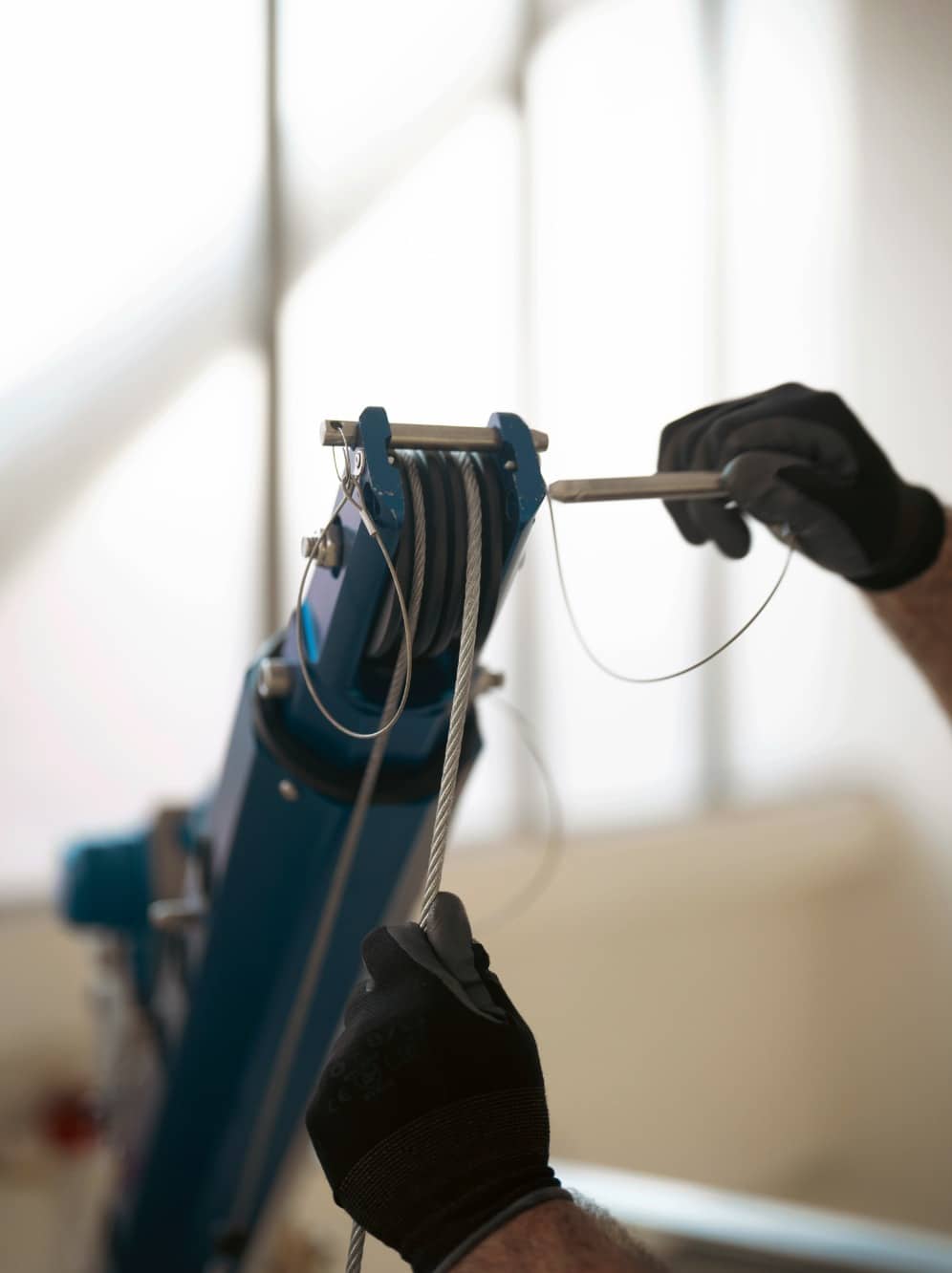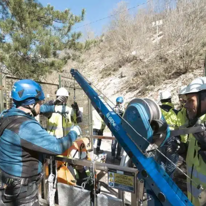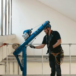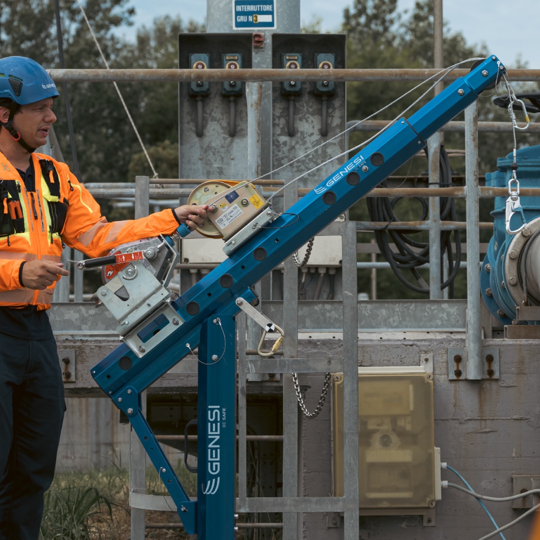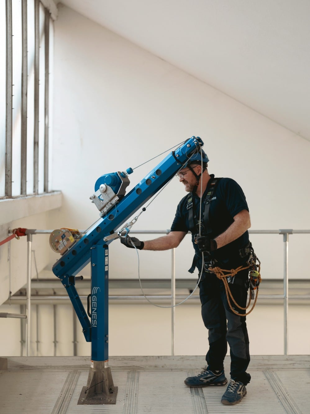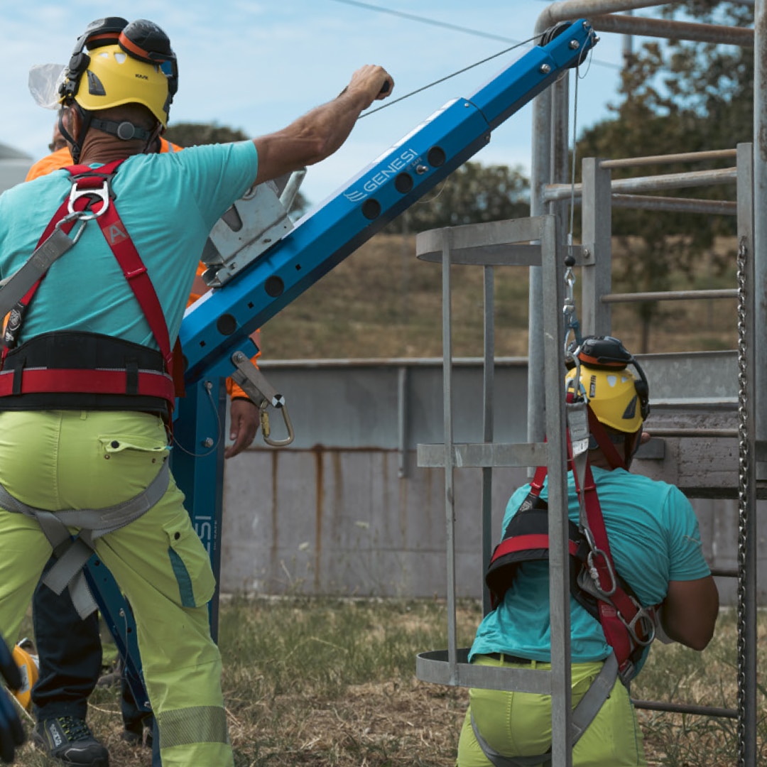 To tilkoblingsplater for fallblokk med redningsfunksjon eller vinsj er inkludert som standard, og systemet har et ekstra forankringspunkt. Sertifisert for simultant bruk av inntil 3 operatører. Alle komponenter er sporbare via integrert NFC-tag.