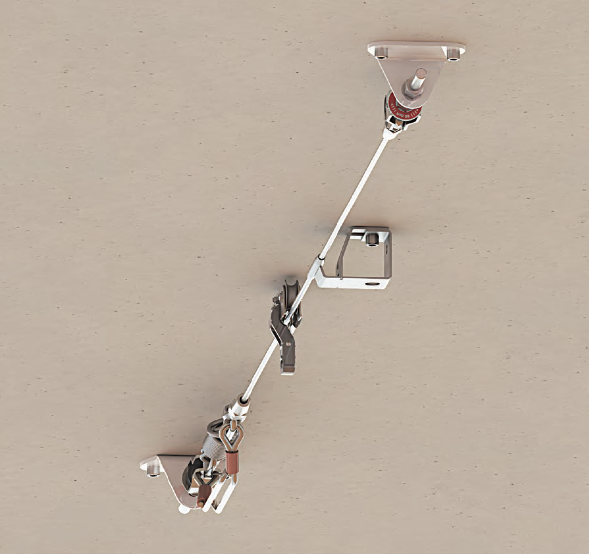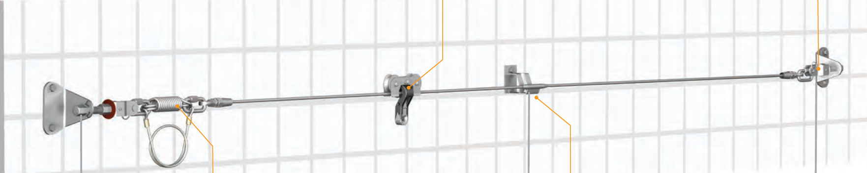 Systemet er utviklet for opptil 3 brukere og er modulært oppbygget med 2-punkt endefester, mellomfester, støttemoduler, energiabsorber og strammer. Det kan monteres på vegger, tak, undersiden av konstruksjoner og i krevende tekniske rom hvor fleksibilitet og kompakt montasje er nødvendig.