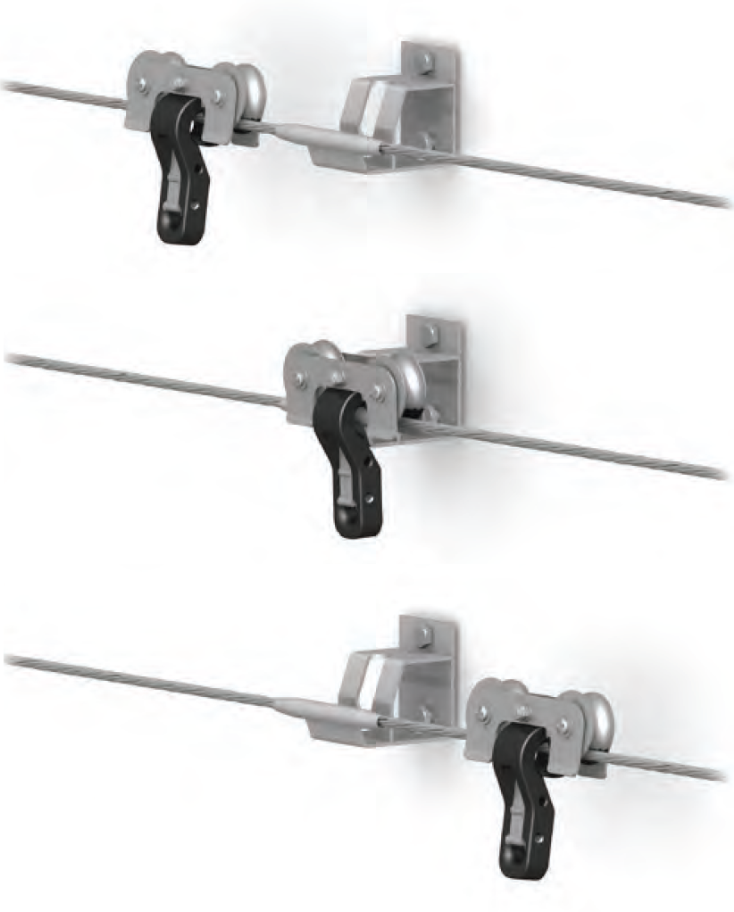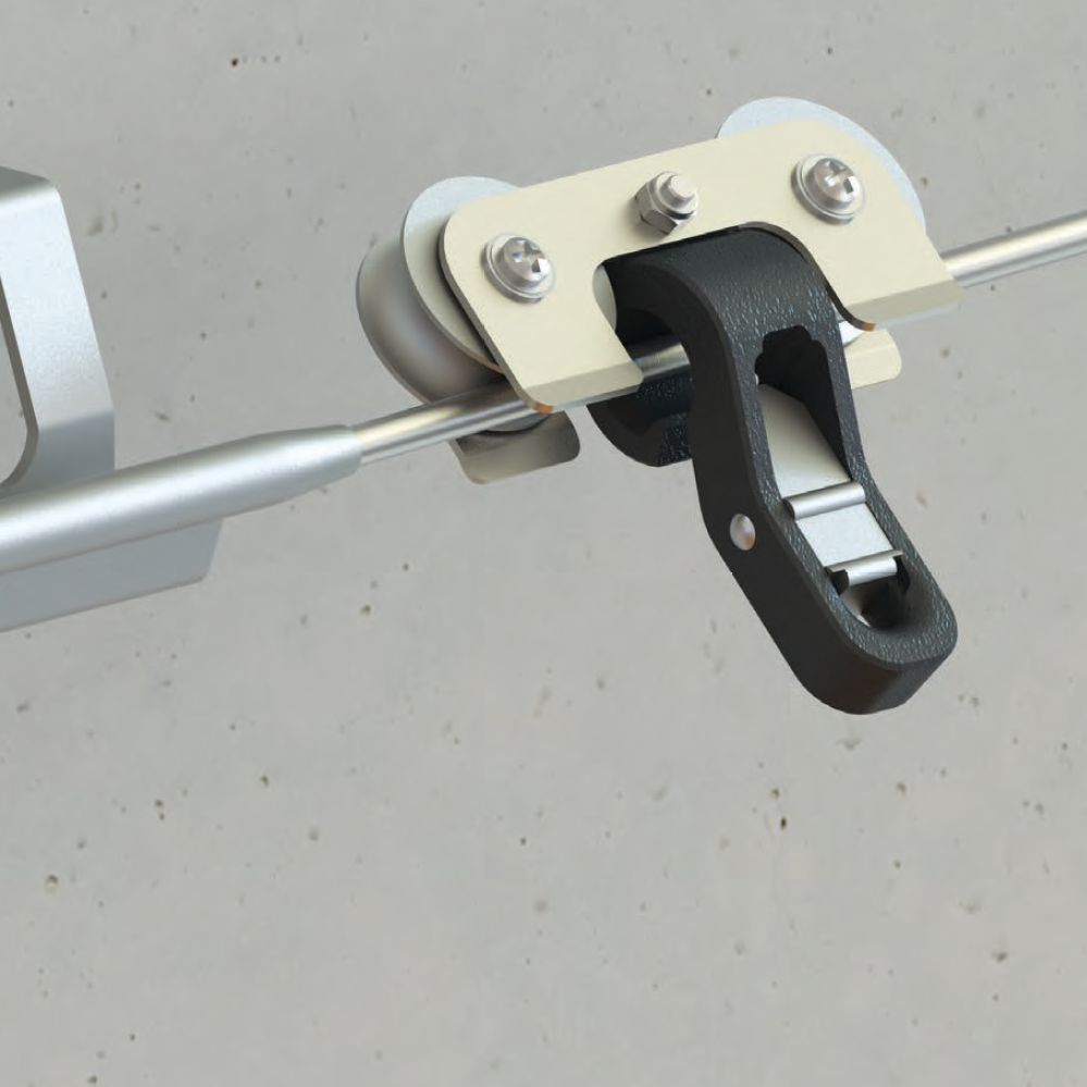 Dette er en hybridløsning som kombinerer fordelene fra tradisjonelle wireanlegg med bevegelseskomforten fra skinnesystemer. Systemet bruker én rustfri 8 mm wire, men den spesielle trallen gir en stødig og kontrollert bevegelse som minner om railsystemer — til en lavere installasjonskostnad.