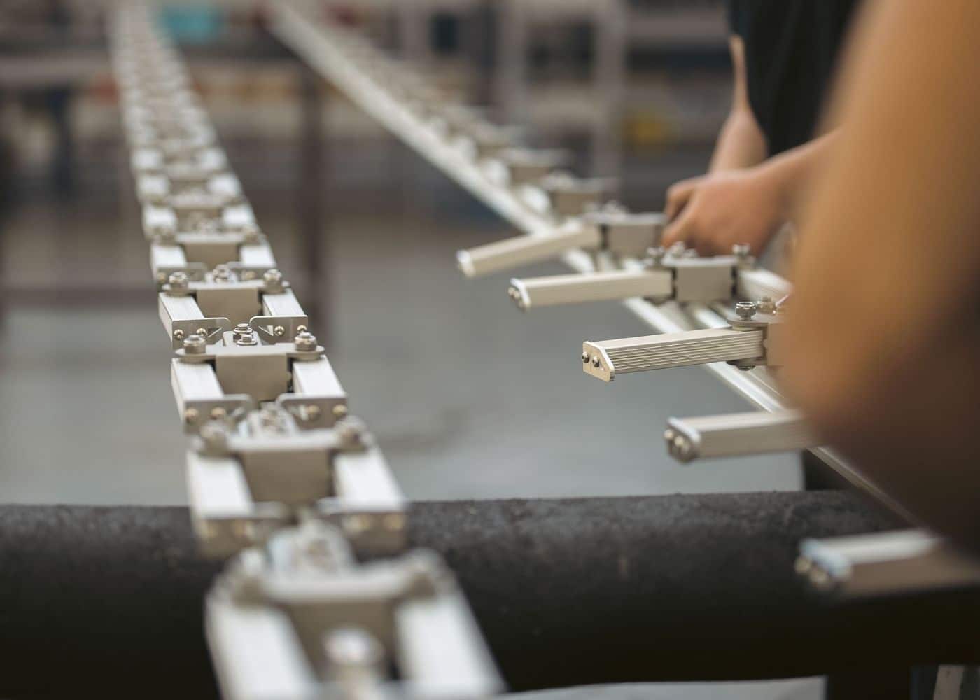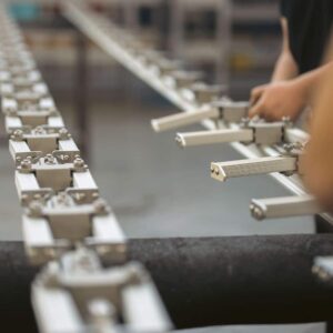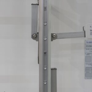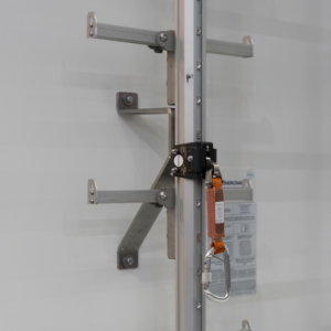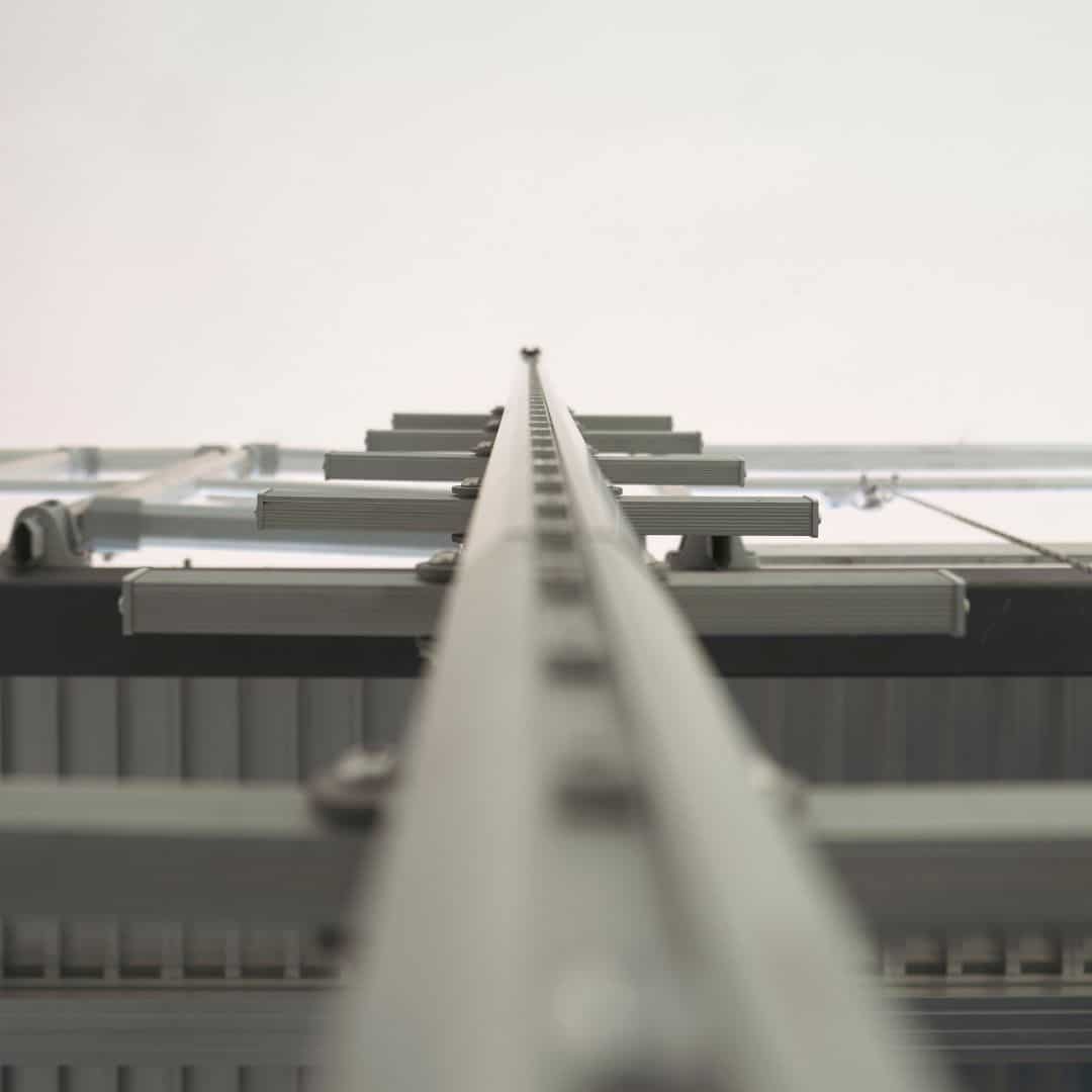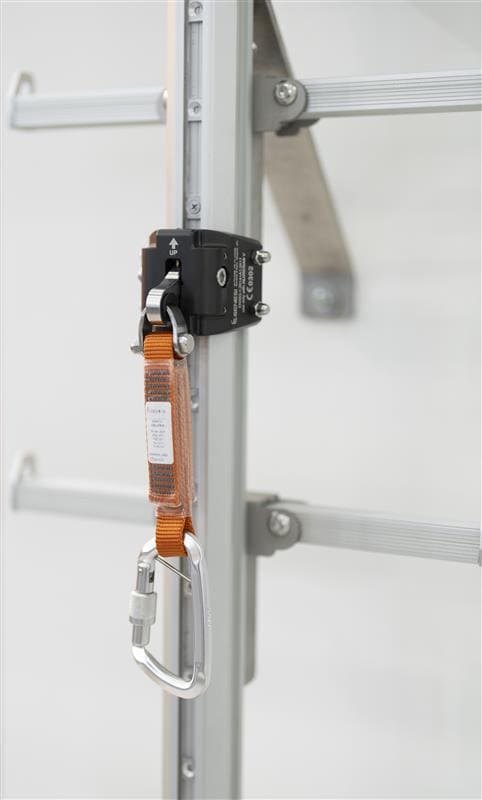 Senterprofilet er AluxCrab V-skinnen, som fungerer som både konstruktivt element og styreskjørt for GTFA-brikken (V-XC10). Det som skiller LadderCrab-I fra mange konkurrerende systemer er det mekaniske stoppesystemet: stopp ved fall skjer ikke bare gjennom friksjon, men via et mekanisk inngrep mot en tannstang integrert i profilen. Dette gir vesentlig høyere ytelse under ekstreme værforhold eller om smuss eller fremmedlegemer kommer inn i systemet.