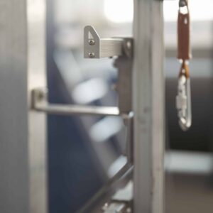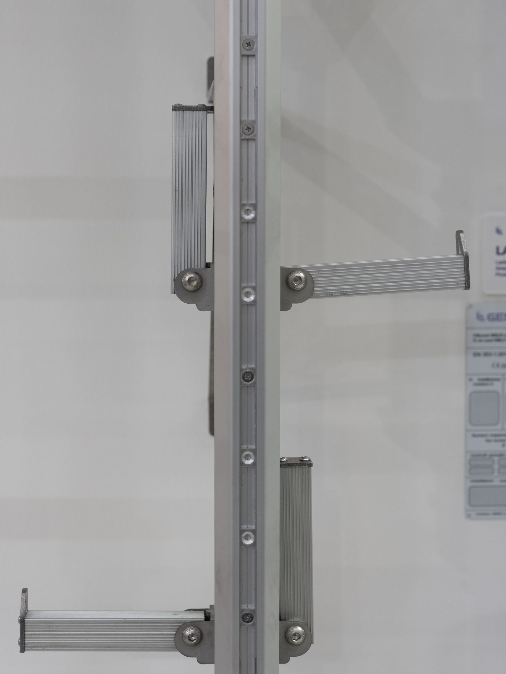 Stigen leveres med aluminiumstrinn i to varianter — faste eller foldbare. Foldbare trinn reduserer visuell innvirkning og er godt egnet i arkitektonisk sensitive miljøer eller der stigen ikke er i daglig bruk. Et bredt tilbehørssortiment gir full konfigurasjonsfrihet: rette landingsplattformer, hvile- og redningsplattformer, samt låsbart anti-intrusjonscover som hindrer uautorisert adgang.