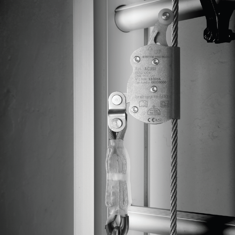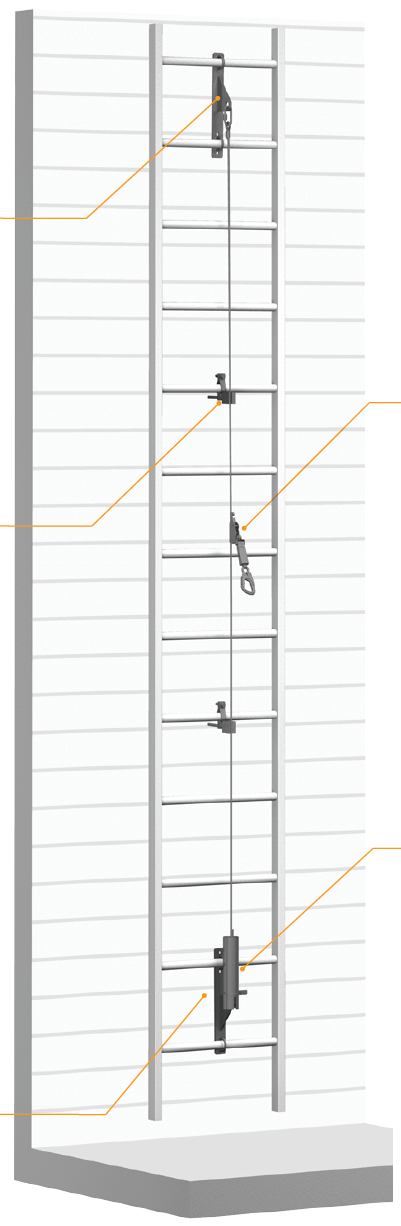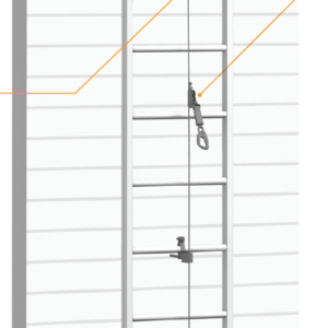 Dette er et komplett vertikalt sikkerhetssystem for faste stiger montert på bygg, tårn, master, siloer og tekniske installasjoner. Systemet bruker en fast rustfri 8 mm wire som går langs stigeløpet, og en glider som følger brukerens bevegelse opp og ned.