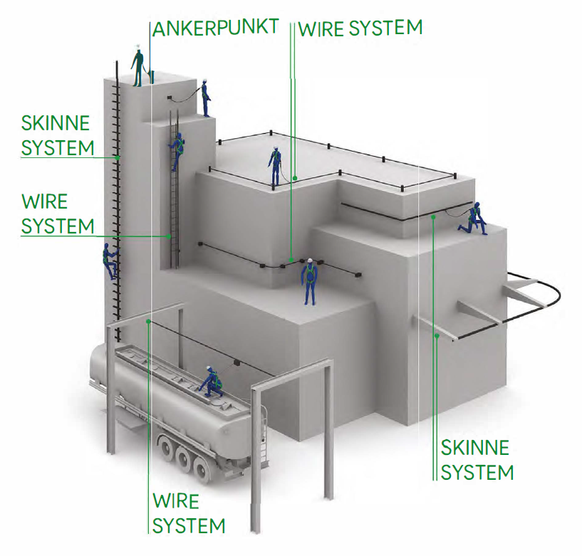 I praksis betyr dette at brukeren kan bevege seg fritt horisontalt eller vertikalt, mens systemet begrenser belastningen mot både kropp og bygg ved et fall. Korrekt planlagt og montert gir slike systemer en robust, langsiktig løsning som både forenkler arbeid i høyden og gjør årlige kontroller mer forutsigbare. Kategorien «Systemer» samler alle horisontale og vertikale wire- og skinnesystemer, uavhengig av om de monteres på tak, fasader, innendørs traverser eller faste stiger.
